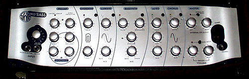 just my typical bass sound. Here's how I use it: The front end is a standard SWR preamp, with controls much like the Bass 350, but with two exceptions. First, the preamp is softer than the old SM-400 to allow for large boosts in gain by the various effects that come later in the chain. Second, the limiter/leveler in the preamp section is far superior to previous SWR models (IMHO). Keeping all that in mind, I boost the Bass about +5 db and keep the treble flat. For midrange I usually keep it flat as well, unless the room is doing something strange. I keep the limiter at minimum (which still leaves it slightly in effect). I run the Aural Enhancer lower ('3') than I used to on the SM-400 ('7'), again to keep the signal flatter so as not to send an "ultra-scooped" EQ through the effects. With the Mike Lull Custom 5 in the active position and mainly flat EQ-wise, I keep the Mo' Bass Preamp Volume around '4'. The first effect in the chain is the Overdrive. I can't tell you how thrilled I am with the sound of this particular circuit. Touch-sensitive and as nasty as I need it, it can give me a Stone Temple Pilots-type rock overdrive edge, or a Rage Against The Machine tree-cutting grind if I need it. It's got two controls, Drive (pre) and Level (post). For rock sounds in the studio, I'll leave it on with both controls at around '3' and blend in the edge with the clean signal (I did this on the latest MullMuzzler record, Nick D'Virgilio's Karma, and some new stuff I did with Yogi that's not out yet). For live stuff, it depends on the song. "Ankle Bracelet" is Drive at '3' and Level at '2'. "Why Am I Your Guy?" is '4' and '3' respectively. For "Kedgeree" I open it up to '5' and '4', but during the verses I play lightly so not all the edge comes through and then for the choruses and bass solos I start nailing it and it cuts the room in half. Any setting over '5' and '5' easily generates feedback any guitarist would be proud to call their own. It's really amazing. Next is the SubWave, a very clean sub-octave. I keep the Tone control at minimum and the Mix control (clean bass vs. sub signal) at 10% past midpoint on the sub side. This shows up in "Kedgeree" in the solo section, as well as in "Killer Fish" in conjunction with the BassSynth. This is by far the most sensitive effect in the chain, with four controls: Filter, Resonance, Envelope and Mix. It converts the input signal directly into a sawtooth wave and sends it through a traditional, analog, four-pole filter. For the most part, I keep the Filter Control at '2', the Resonance at '7' and the Envelope at '3', but the settings for these controls are highly dependent on the amount of input gain feeding into the filter, and, of course, the type of synth sound you're looking for. I keep the Mix control (clean bass vs. synth-filtered bass) at around 25% to the synth side, as I need some of the hard attack of the actual bass signal to counter the soft impact of a sawtooth wave. And I always use the Mo' EQ at the same time, which enhances the BassSynth's sharpness factor by a considerable degree. I also use the Filter Sweep Pedal on the Mo' Control Master Footswitch when I want greater flexibility than the attack of my fingers can provide. My Mo' EQ settings are as follows: Treble +7, Midrange +9, Bass +1. I kick this on whenever I use the Overdrive or BassSynth, and sometimes with the SubWave as well if I want to cut through more. The Chorus onboard is deeper and richer than most I've heard, but it doesn't quite have the dynamic range of the T.C. Chorus/Flange. That being said, I've been using the Mo' Bass chorus live on a ton of songs and it's been sounding great in the house, as well as my own rig. Settings: Depth at '3', Rate at '2'. For me, the most important aspect of using these effects is combining them in the right way for different songs. For the Boosty-ish sound in the intro to "Killer Fish", I use SubWave, BassSynth, Mo' EQ and Chorus. For the 5/4 solo section in "Kedgeree", I use SubWave, Mo' EQ and Chorus. For "Why Am I Your Guy?" I just use Overdrive and Mo' EQ. For something totally weird, like "The Boing-Ah Steroid" (from the Nonkertompf live performance in Groningen, Holland in October of 2001), I used Overdrive, BassSynth, Mo' EQ and Chorus, and in the end of the song I turned the Drive and Chorus Rate all the way up to maximum, causing feedback that sounded as if Jimi Hendrix was conducting a lunar landing. This has gone on way too long already, so let me wrap this up as quickly as I can. Both live and in the studio, I send two XLR outs to the house--Direct Out and "Mo' Bass" (post) Out--both with -10db pads at their outputs. I send various other audio outs to external sources (see The Current Rig for greater detail). For a killer, post-everything EQ circuit, I run the Raven Labs True Blue EQ in one side of the stereo effects loop, and blend it back in at 50/50 on the Mo Bass External Effects Blend control. For power I bridge the Mo' Bass itself into one Goliath II 4x10 cabinet, which keeps the power amp at a relatively cool 8 ohms while other audio outputs reach other external power sources for plenty of juice all around. And the Mo' Control Master Footswitch makes switching a joy, either in and out of individual effects or up to four programmable groups of effects like I mentioned above. All praise goes to Mo West (effects, routing, concept) and Steve Rabe (preamp, power amp), the twin daddies of the kick-ass circuitry contained within. Even more information, including details on the development of the project, can be found over at the SWR Website by clicking on "Products" and then "Mo' Bass." The Mo' Bass project has not been devoid of controversy and varying opinions; nothing this ambitious ever is. And it may be impossible for me to be objective at this point, for obvious reasons. But all that matters