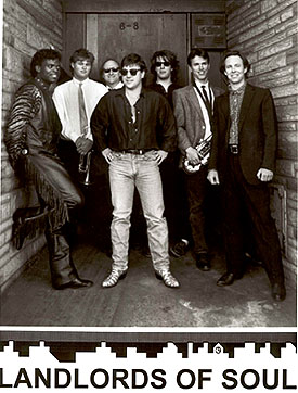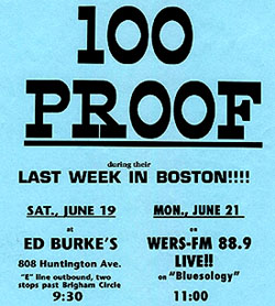 spun; you mean you can get paid for playing music? It's not just We played every watering hole in the greater Boston area (if you're local, you'll recognize these places): Harper's Ferry, the Sit 'n' Bull, T.T. The Bear's, Ed Burke's, The Commonwealth Brewery, The Ranch House, Cobblestone's, The Grog, Ginella's, The Bog Of Allen, The Midway Café.three sets a night, 9 PM to 1 AM or later. You can probably guess from the picture that the lead singer, Charles, did a pretty mean James Brown impersonation. In case you're wondering, that's me, third from the right. Seeing as this was my first real gig, I had to learn all sorts of R&B standards for the first time. I didn't know "Mustang Sally", "Brick House", "Papa's Got A Brand New Bag", or anything like it. I did after three months with these guys, believe me. They also had some originals-decent ones, too-and I'm pretty damned sure I recorded a demo tape with them, but hell if I know where it is. In the end, I took two things away from my experience with the Landlords: one, I learned what playing in the real world was like, with its bars, club owners, drunken patrons, and subsequent thoughts about what I was doing with my life; two, I collected a list of clubs and contacts I'd later use to book our very own blues band, 100 Proof. I've often said that I assiduously avoided the whole hair/shred/spandex movement that swept the muzo nation in the '80s and early '90s. This is as close as I ever came to violating that tenet. I never