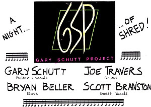 up about a frontman for a band named Kathouse. There were three part harmonies and unison licks galore; thinking back on it, we wanted to be Extreme more than anything else (you can have it all-heavy metal chicks and muzo respect!). Again, there's a demo tape somewhere, copied onto the 'B' side of one of my archive cassettes, but even I'm not sure I'm brave enough to listen to it. It was fun, though, and I have Nate to thank for introducing me to the girl who went on to become my college sweetheart for the next two years. See? Play hard rock, get the chicks. No wonder everyone was dressed so silly back then. Gary Schutt was a multi-talented, unreformed hard rocker who went out of his way to write difficult, chops-laden material stacked with beyond-Extreme vocal harmonies. I really liked his stuff, and thought it would be an interesting challenge to see how well I'd do in such a format. But how I ended up as the bass player in this trio is one of the enduring mysteries of this time period, because I was about as ill-suited for the job as you could imagine.