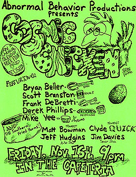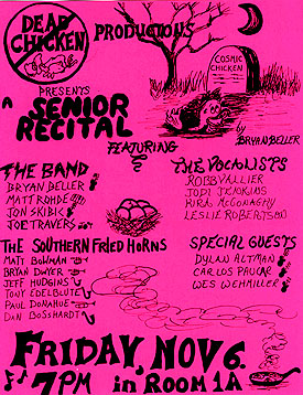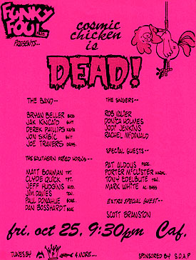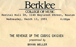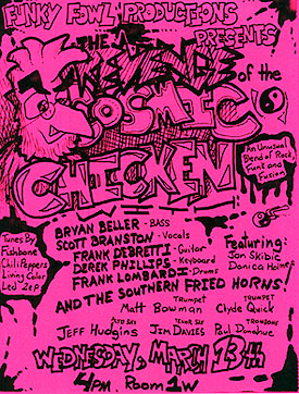 Show #1: Cosmic Chicken, 11/16/90 There were two places to play and be seen at Berklee: either in a recital hall during the day, or in the cafeteria at night. Of course, in order to get people to come see you-unless you were one of the "star" players, which I certainly wasn't-you had to promote. You needed a catchy name, a flashy sign, and you needed to hang those signs everywhere. Quaint, compared to the music business we now know and don't love, but simple. Two kinds of players went to Berklee-those who played in shows organized by others, and those who organized. I was-surprise!-an organizer. It was by default, really; no one was asking me to play in their shows anyway. So I went ahead and organized my own, with the help of keyboardist Derek Phillips, and somehow a funk-based project we called "Cosmic Chicken" was born. Featuring "The Southern Fried Horns," we'd be a nine-piece, booty-shakin' funk machine comprised primarily of white guys from the northeastern suburbs.