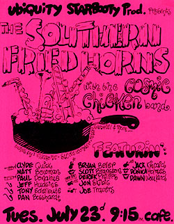Show #3-The Southern Fried Horns, 7/23/91 The ball was rolling, and the horn players were becoming a section with name recognition of their own. Two of them-trumpeter Matt Bowman and Alto Sax player Jeff Hudgins-had been with me from the beginning, and wanted to do a summer show of horn-focused music. It would be "The Southern Fried Horns-with The Cosmic Chicken Band". We were marketing now, baby.