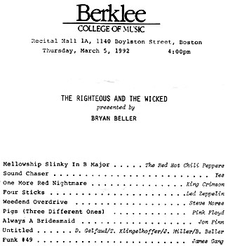 Joe Travers left Berklee for Los Angeles in the Fall of 1992, leaving me with a dilemma. I hadn't organized a show without him in the drum chair in over a year, and my senior recital was fast approaching. I had no desire to do it without him, so there was only one thing to do-fly him back out to Boston for a week. This was undoubtedly the best band I ever had at Berklee. Joe Travers and The usual southern-fried horn players were there as always, but with better background singers, a future first-call pro keyboardist (Matt Rohde), and special, special guests.
