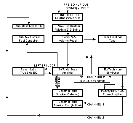 From there I go into the passive/active input on the SWR Mo' Bass. I run the preamp EQ mostly flat, save for a +5 db boost on the Bass control (and occasional midrange boost or cut depending on the room). Since the analog effects onboard the Mo' Bass are after the preamp EQ in the signal path, I do my best not to apply drastic amounts of EQ before the signal reaches those effects, as this isn't always desirable from a tonal standpoint. The Mo' Bass effects are controlled via the Mo' Control master footswitch, which runs a comfortable 25 feet out from the back of the amp to just below my happy feet. Once the signal has traveled past the effects section of the Mo' Bass, I use the Raven Labs True Blue EQ in the left side of the stereo effects loop, which gives me nearly limitless post-effects EQ capabilities. (Details on how I use specific Mo' Bass settings can be found in the dedicated Mo' Bass section in this corner of the site.) Now for the power side of the equation. I'm a big believer in power amp headroom, and as such I try never to run power amps at 4 ohms, regardless of what the power rating might be. Some people believe in getting just as much power as they need, and then running their amp to its fullest potential on every gig they play (which usually means bridging the amplifier at 4 ohms). Can you do that? Sure, but I don't care what your amplifier manufacturer says (SWR or otherwise), the amp will run hotter, components will fail sooner, and unless you're running an all-tube power amp, there are noticeable losses in sound quality at high volumes. I believe in running everything at 8 ohms, and if you need more power than your amp can deliver at 8 ohms, the answer is to go out and make the investment in an additional power amp. OK, now that you know that I run the Mo' Bass power amp bridged at 8 ohms into one Goliath II 4x10, the bottom cabinet. Then I get audio outputs on the Mo' Bass from two locations: the ¼" Mo' Bass Out (a post-everything line out) and the Right Effects Send (a line out that's after the Mo' Bass preamp and effects but before the True Blue EQ). Both signals go through an Eb-Tech Hum Eliminator (I tend not to take chances with ground loops) and then into both channels of the Peavey DPC1000 Power Amp, which I run in stereo. The Mo' Bass Out goes to the DPC1000's Channel 1, which I run into the second (top) Goliath II 4x10 cabinet. The Right Effects Send goes to Channel 2, from which I run an extremely long speaker cable out to the Bass Monitor 12", which I use as a dedicated stage monitor regardless of what else happens to be in the monitor mix (if there even is one). (If you only play gigs where your rig provides the bass for the entire room, and you never have to worry about sending your signal to a P.A., feel free to skip the rest of this already interminably long section.) So what do I get from all this? A gigantic monitor. That's what bass rigs are, you know, and aside from keyboard rigs, it makes a bassist's lot on stage unique. In the case of guitar, drums and vocals, what you hear is then miked and reproduced as faithfully as possible in the front-of-house mix. A guitar amp may switch from clean to dirty, but either way the thing is miked and it goes straight out to the house, because a guitarist wants the sound of his amp in the mains no matter what. With bass, you may sometimes see a cabinet miked, but 99% of the time you're sending a direct signal to the house as the main audio source. This is because BASS IS DIFFERENT. The EQ settings on your amplifier that you want coming out of your rig on stage--with the bass boosted and whatnot--are nine times out of ten not the proper EQ for the front-of-house engineer to get your bass into the live mix. Instead, he wants the flattest signal possible (read: direct) to work with. And he's right. Some mixers will then take an additional channel for a miked cab, a post-EQ sound, or what have you. I've spent a lot of time working on the best way to get bass effects into the house, especially distortion. I've heard audience recordings of Keneally/BFD, and in the past I lamented the fact that what I thought was the Best Overdriven Bass Sound On Earth was actually going no further than the edge of the stage most of the time. But now, with the Mo' Bass, I can get a killer overdrive in the house WITHOUT having to mike a cab. This is very important, because once you mike a bass cab, that sound is there for the whole show, not just when you want the overdrive on. (Unless you bring an extra cab and run a completely separate channel that you switch on and off which I used to do in my older rig.) For clean bass, I dont like the sound of a cab miked in live settings. I do like the sound of the Mike Lull direct, but since the effects are by definition post-direct on the Mo' Bass, you need to get those sounds to the house as well. So it's simple: The Mo' Bass conveniently has two separate XLR outputs, and I use them both. The first, labeled Direct Out, is just like it sounds (the line/direct switch is set to the "direct" position). The second is called Mo' Bass Out, and it's post-everything. I instruct the front-of-house engineer to mix the two signals 50/50, and there you have it. This does mean that the signal reaching the house only has half as much "affected" signal as does what's coming out of my onstage rig and that's OK. There's nothing worse than being at a show where the bassist kicks on his effects and suddenly all the bass goes away. The way I have it set up, the front-of-house guy always has a direct signal to lean on (so he can resist the urge to screw around with the affected channel), and I have everything I need in terms of compensation for EQ, levels, etc. onstage with me in the name of my own rig. And I'm happy to report that the current rig, which I debuted at NAMM in January of 2001, has passed the ultimate test with flying colors. Audience recordings from the May '01 Keneally/BFD "Dancing" Tour have left a 