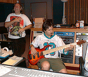 Mike Keneally: singer, guitarist, keyboardist, composer, former member of Frank Zappa's 1988 touring band, former bandmate in Dweezil and Ahmet Zappa's band Z, bandleader of the Mike Keneally Band (formerly known as Mike Keneally and Beer For Dolphins; the band name changed in 2002), mentor, partner, friend. Cornerstone of my musical life both professional and spiritual. It's hard to know where to begin. Over the past eight years, we've taken a flying leap of faith together, experienced bitter disappointments and savored many triumphs, toured under conditions both hardscrabble and luxurious, played Beer For Dolphins and Mike Keneally Band gigs as a power trio, a quartet, 5-piece, 6-piece, 7-piece, 8-piece, and 11-piece band. All the while, Mike and I have remained at the center, wielding a broadband musical connection nearly indescribable in nature. Our musical roles have cemented over the years. Mike pushes the envelope onstage, stretching arrangements to their very limits, changing forms on the fly, turning serious material into humor and comedy into art. I keep both feet firmly planted on the ground, feeling the sudden shifts more than seeing or hearing them, and relaying the smoke signals to the rest of the band when necessaryall the while providing a steady, constant contrast to Keneally's hair-trigger musical mood swings. Often it feels like steering a small vessel through a tropical storm, but one that never manages to completely overtake the ship, because I won't let it. The conflicting methodology-and, of course, Keneally's stratospheric songwriting and playing ability-is the core of the band's sound. Every year since 1996-the year that we left Dweezil and Ahmet Zappa's band Z together -the work I've done with Keneally has become more and more rewarding. Anything I consider to be a definitive statement of me as a bassist has happened right here. Live album? 1996's Half Alive In Hollywood. Studio album? 2000's Dancing. Touring band? The November '01 Quartet Tour. In countless ways, Keneally's material has defined me as a bassist, both onstage and in the studio. Even the core essence of the Keneally/Beller mainline has been distilled and made available for consumption, in the form of our "acoustic duo" clinic performances for Taylor Guitars. In this format, it's just the two of us with acoustic instruments, stripping the most complex arrangements down to the bone and laying bare the elements of the song's composition. It's yet another way to express the profound musical connection I share and value with Mr. K. Up until 2002, I'd never written music. It was one of those things that I'd never been inspired to do; I'd never woken up in the middle of the night with a startlingly original melody in my head. Thankfully I didn't have to, because it happened to Keneally just about every night. His influence and inspiration over the years were instrumental in getting me to the point where I actually could produce something original. That's as close as I can come to describing how much this material means to me. It's complex and challenging, but not offensively so; it's humorous, but not silly or stupid; it's spiritual and fraught with meaning, but without being overly grandiose or melodramatic. It's my favorite music in the world, and would be even if Mike Keneally had never heard of me. In this