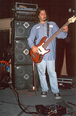 The settings on the Fender Jazz Deluxe V were as follows: master volume up full, pan-pot centered (always), bass boosted about 40%, treble boosted about 20%, midrange boosted just a hair. The Ernie Ball volume pedal was for silent tuning and the infrequent volume swell. The Boss Tuner was standard-issue, and though mostly reliable had problems tracking low 'B' (an annoyance when I had to tune down to A# for Keneally's "Looking For Nina"). My pedalboard was a small, custom-made, Velcro-laden masterpiece by the one and only Thomas Nordegg. The chain went from the Volume pedal into the ancient DOD Octave Pedal, which by 1998 needed the occasional kick to work correctly, but always provided a decent, traditional octave. Then it was into the T.C. Chorus/Flange (a wonderful unit) before splitting at the Whirlwind A/A+B box. The 'A' signal was always on and went straight to the SansAmp PSA-1 Preamp. This may be misleading--I didn't use the PSA-1 as a preamp. I left it in true bypass mode for most of the time, except for when I wanted a slightly overdriven, "Ampeg"-type sound (used in the studio on Keneally's "'Cause of Breakfast"; used live on Keneally's "Performing Miracles", "Looking For Nina", "Weekend" and several others). Switching in and out was done by a small, custom footswitch which was mounted on the NordeggPedalboard. Most importantly, I sent my main direct signal to the board from the back of this unit, which truly was direct unless I had the PSA-1 "Ampeg" setting engaged. (By the way, the "Ampeg" sound I'm referring to was a custom job I programmed myself.) I had no problem with letting the Fender's direct-to-the-house sound carry the day for the majority of the time. I then sent a ¼" output from the back of the PSA-1 to the front of the rack, namely the passive/active input of my trusty old SWR SM-400, made in 1989. (Details on particular settings for this cornerstone of my old rig can be found in the dedicated SM-400 section in this corner of the site.) As I mentioned in the explanation of my current rig, I believe in power amp headroom, and as such I never run my amplifiers at impedances less than 8 ohms. So the SM-400 was bridged mono and then run into one Goliath II 4x10 cabinet (the bottom). At the same time, I ran the Mono Effects Send (a post-everything line out) to Channel 1 of the Peavey DPC1000 stereo power amp, which powered the second Goliath II 4x10 cabinet (the middle). Real simple: the SWR sound powered as loudly and with as much headroom as possible. But then there was the 'B' rig--the overdrive channel. Back at the pedalboard I split the signal into 'A' (everything I just described above) and 'B'. 'A' was always on, and 'B' was something I clicked on as a distorted boost, in effect making my switcher an A/A+B box as mentioned previously. The 'B' signal went from the pedalboard to the input of the SWR Interstellar Overdrive, a full-boat preamp equipped with power amp tubes that I used as a wide-open distortion unit (exact settings are listed in the dedicated Interstellar Overdrive section of this site). The unbalanced out of the Stella (as I called her in shorthand) went through the Eb-Tech Hum Eliminator, a unit I picked up specifically because of ground problems between the Stella and the Peavey DPC1000. Anyway, after the hum was eliminated, the signal went into Channel 2 of the DPC1000, which powered an SWR Goliath Junior III 2x10 cabinet that sat on top of the other two 4x10's, making my rig nearly as tall as Manute Bol. This 2x10 cabinet (with the tweeter totally cut) was miked, as the Stella's overdriven signal at the XLR output wasn't the way to go. But the sound that came out of the cabinet was ungodly, quite simply the best bass distortion I'd ever heard. And I made sure it was nice and loud when I kicked it on, but that didn't stop soundmen around the country from never mixing that channel as loud as it should have been. I can't tell you how many times I emphasized the point--"it's a boost channel, it's supposed to get louder when I kick it on"--but for one reason or another, whenever I listened back to audience recordings, it ended up sounding like some additional "edge" as opposed to flat-out grinding distortion like it sounded to me onstage. Every once in a while I heard it on a bootleg tape the way it should have been mixed everywhere, but usually it just didn't happen. (Note to self: clone self, train Beller II to become front-of-house engineer.) So I tried not to obsess over it, but after the twin 1998 tours I kept my eyes open for other alternatives. Then along the SWR Mo' Bass, which changed everything.