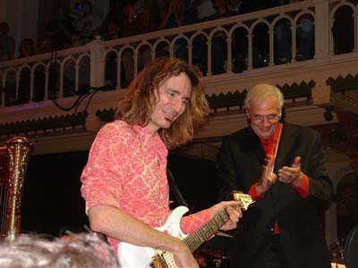 The first tune of the show was called "Is It Over Yet?", and rightly soit was a 10-minute-plus tour de force of variations on a new musical theme interspersed with excerpts from some of Steve's older material ("Lucky Charms" and "There's A Fire In The House" were two of them). But the showstopper was a four-minute violin cadenza written, in Steve's words, "to break the violinist's back". The responsibility for playing such an impossibly difficult thing falls to the first violin section leader, or the "concertmaster." (Think of this person as the lead guitarist of the orchestra.) The Metropol's concertmaster was a quiet, unassuming, middle-aged lady named Arlea. One of the most amazing musical things I've ever seen was the sight of this relatively obscure Dutch lady absolutely tearing the shit out of a true Steve Vai solo piece, something that would have been mindblowing on guitar, let along violin. The orchestra broke out into spontaneous applause after the first time she did it in rehearsal.
