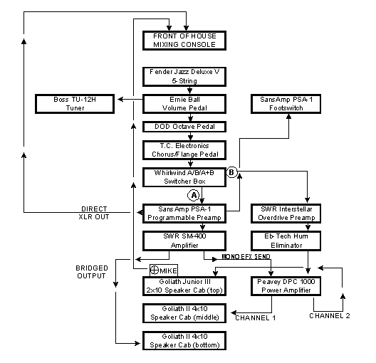 The settings on the Fender Jazz Deluxe V were as follows: master volume up full, pan-pot centered (always), bass boosted about 40%, treble boosted about 20%, midrange boosted just a hair. The Ernie Ball volume pedal was for silent tuning and the infrequent volume swell. The Boss Tuner was standard-issue, and though mostly reliable had problems tracking low 'B' (an annoyance when I had to tune down to A# for Keneally's "Looking For Nina"). My pedalboard was a small, custom-made, Velcro-laden masterpiece by the one and only Thomas Nordegg. The chain went from the Volume pedal into the ancient DOD Octave Pedal, which by 1998 needed the occasional kick to work correctly, but always provided a decent, traditional octave. Then it was into the T.C. Chorus/Flange (a wonderful unit) before splitting at the Whirlwind A/A+B box. The 'A' signal was always on and went straight to the SansAmp PSA-1 Preamp. This may be misleading--I didn't use the PSA-1 as a preamp. I left it in true bypass mode for most of the time, except for when I wanted a slightly overdriven, "Ampeg"-type sound (used in the studio on Keneally's "'Cause of Breakfast"; used live on Keneally's "Performing Miracles", "Looking For Nina", "Weekend" and several others). Switching in and out was done by a small, custom footswitch which was mounted on the NordeggPedalboard. Most importantly, I sent my main direct signal to the board from the back of this unit, which truly was direct unless I had the PSA-1 "Ampeg" setting engaged. (By the way, the "Ampeg" sound I'm referring to was a custom job I programmed myself.) I had no problem with letting the Fender's direct-to-the-house sound carry the day for the majority of the time. I then sent a ¼" output from the back of the PSA-1 to the front of the rack, namely the passive/active input of my trusty old SWR SM-400, made in 1989. (Details on particular settings for this cornerstone of my old rig can be found in the dedicated SM-400 section in this corner of the site.) As I mentioned in the explanation of my current rig, I believe in power amp headroom, and as such I never run my amplifiers at impedances less than 8 ohms. So the SM-400 was bridged mono and then run into one Goliath II 4x10 cabinet (the bottom). At the same time, I ran the Mono Effects Send (a post-everything line out) to Channel 1 of the Peavey DPC1000 stereo power amp, which powered the second Goliath II 4x10 cabinet (the middle). Real simple: the SWR sound powered as loudly and with as much headroom as possible. But then there was the 'B' rig--the overdrive channel. Back at the pedalboard I split the signal into 'A' (everything I just described above) and 'B'. 'A' was always on, and 'B' was something I clicked on as a distorted boost, in effect making my switcher an A/A+B box as mentioned previously. The 'B' signal went from the pedalboard to the input of the SWR Interstellar Overdrive, a full-boat preamp equipped with power amp tubes that I used as a wide-open distortion unit (exact settings are listed in the dedicated Interstellar Overdrive section of this site). The unbalanced out of the Stella (as I called her in shorthand) went through the Eb-Tech Hum Eliminator, a unit I picked up specifically because of ground problems between the Stella and the Peavey DPC1000. Anyway, after the hum was eliminated, the signal went into Channel 2 of the DPC1000, which powered an SWR Goliath Junior III 2x10 cabinet that sat on top of the other two 4x10's, making my rig nearly as tall as Manute Bol. This 2x10 cabinet (with the tweeter totally cut) was miked, as the Stella's overdriven signal at the XLR output wasn't the way to go. But the sound that came out of the cabinet was ungodly, quite simply the best bass distortion I'd ever heard. And I made sure it was nice and loud when I kicked it on, but that didn't stop soundmen around the country from never mixing that channel as loud as it should have been. I can't tell you how many times I emphasized the point--"it's a boost channel, it's supposed to get louder when I kick it on"--but for one reason or another, whenever I listened back to audience recordings, it ended up sounding like some additional "edge" as opposed to flat-out grinding distortion like it sounded to me onstage. Every once in a while I heard it on a bootleg tape the way it should have been mixed everywhere, but usually it just didn't happen. (Note to self: clone self, train Beller II to become front-of-house engineer.) So I tried not to obsess over it, but after the twin 1998 tours I kept my eyes open for other alternatives. Then along the SWR Mo' Bass, which changed everything.