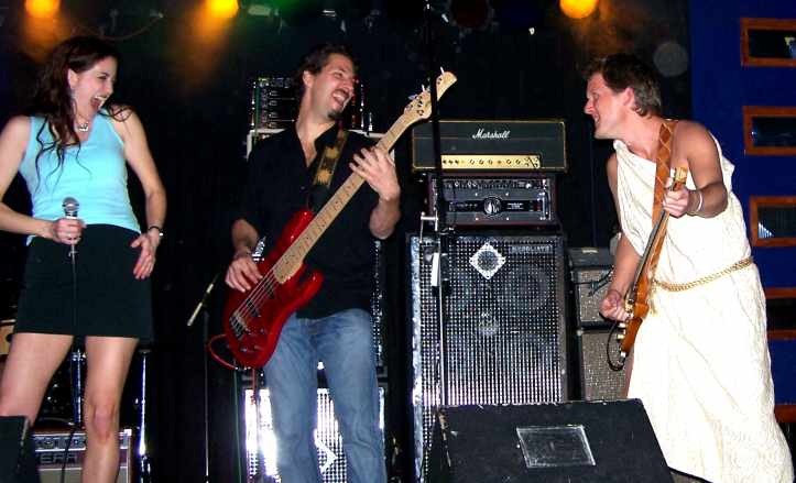 DOUBLE GIG REPORT: The two Keneally gigs this week were quite a bit of fun. The Knitting Factory is a wonderful venue, and though the rust was showing a little, it was a good exercise at struggling in a musical fashion.The San Diego gig at Victor's was more fun, a lot tighter, and a hell of a lot more interesting.It took place in a restaurant/bar next to a golf course, and the "clubhouse party tent" had been rented out to a hip-hop rave promoter who specialized in serving drinks to minors.The vice cops made a surprise appearance and, after having found several 17-year-old girls with fake I.D.'s happily swigging the hard stuff, busted the joint in grand fashion.There were beefy security guys tussling with angry young men inside the club and out as we were loading out.And you thought California was mellow.Oh yeah, the gig—I liked it.Much better than the Knitting Factory, but still not as good as the height of the Quartet Tour, IMHO.I have a really good feeling about the gig in May at Palladino's.We're more Valley than Hollywood anyway.